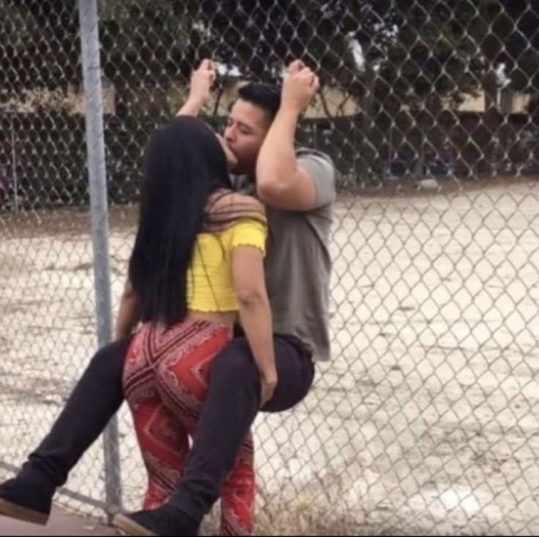 This couple decided that traditional kisses were for amateurs. Kissing against a fence is the new trend!